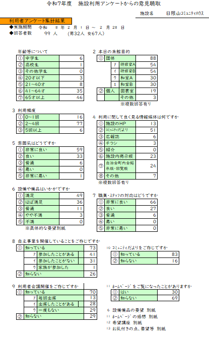 2月に実施致しました「令和7年度施設利用アンケート」を集計いたしましたのでご報告させていただきます。