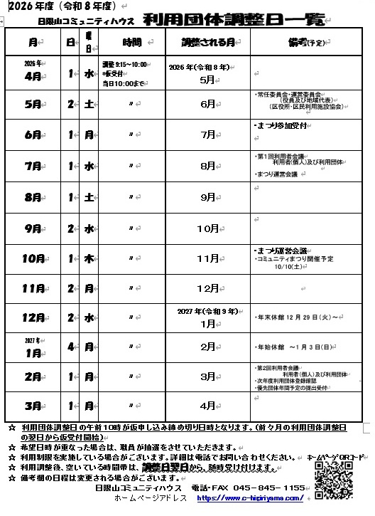 令和8年度利用団体調整日一覧はこちらをご覧ください。